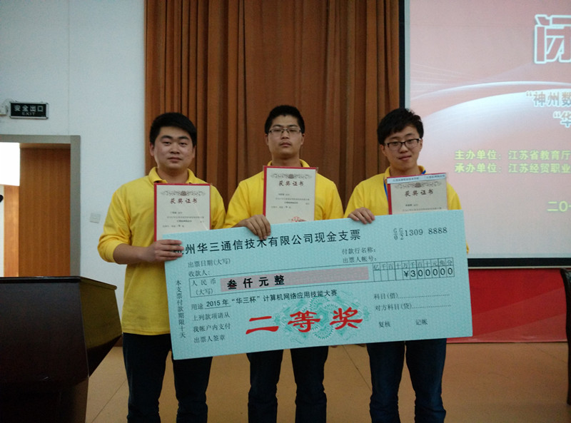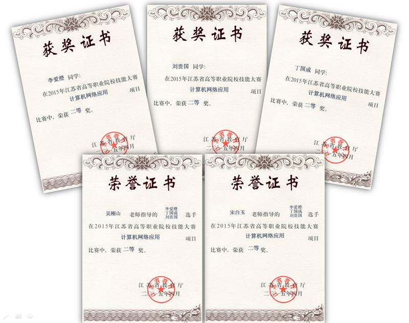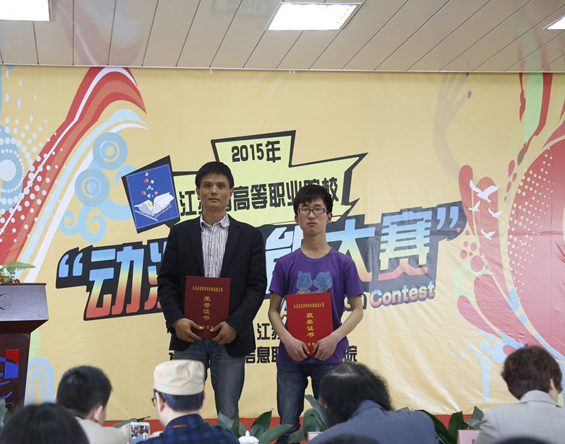 4月25日至26日,2015年江苏省高等职业院校技能大赛“计算机网络应用”赛项与“动漫设计及制作”赛项在南京、常州举行。信息工程系学生在本次大赛中取得优异成绩,李爱澄、刘贵国、丁国威三位同学在“计算机网络应用”赛项中喜获二等奖,张金波同学荣获“动漫设计及制作”赛项二等奖。