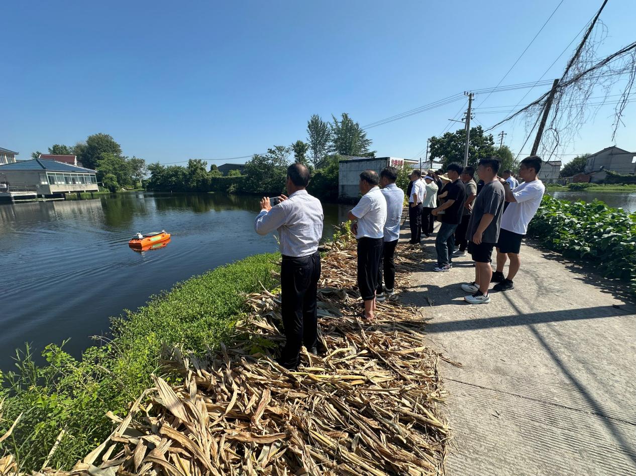 在村前的空地上,“惠农飞防”成员们熟练地操作着最新研发的植保无人车,进行雾化喷洒作业展示。无人车按照设定的行进路线,均匀地实现雾化喷洒,其高效的作业能力让围观的农户们啧啧称奇。而在东湖村的鱼塘里,另一番景象同样引人瞩目——水产养殖无人船正在自主巡航,有条不紊地开展投饵、施药、增氧作业,全程无需人工参与。这些高效便利的新型农机装备,让农户们大开眼界,引得他们纷纷上前咨询技术细节。