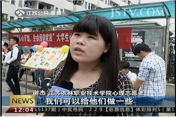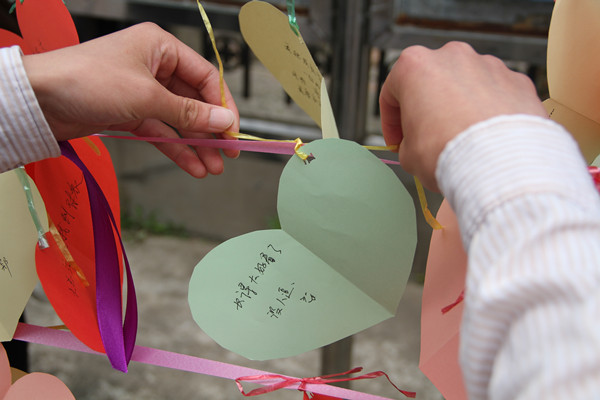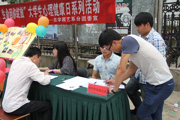 5月22日,在5·25全国大学生心理健康日来临之际,农学园艺系分团委联合学院心理咨询中心在学院食堂门口举行了以“健康从心开始,生命因你绽放”为主题的活动。江苏公共频道对此进行了报道。 此次活动分为心理健康测试、爱的抱抱、烦恼写出来和7天不抱怨四个环节。过往同学纷纷驻足,做一个心理小测试,认知自我;系一条紫色的丝带,时刻提醒着自己要控制情绪;与可爱的人偶来一个亲密的拥抱,感受爱;将自己的烦恼写在爱心上并亲手挂在红绳上,让烦恼随风飘荡,远离自己。大家通过参加活动,充分认识到了保持心理健康的重要性。 链接地址:江苏公共频道http://www.jstv.com/c/gg/xwkjz/201505/t20150525_15773243.shtml