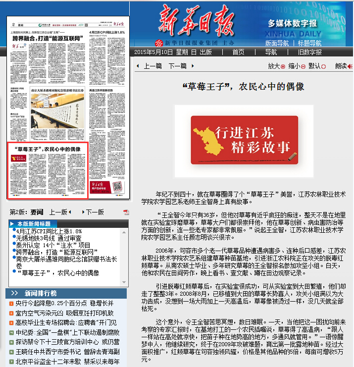 这个意外,令王全智苦思冥想,数日难眠。一天,当他把这一困扰向前来考察的专家汇报时,在基地打工的一个农民插嘴说,草莓得了高温病,“跟人一样站在高处就凉快,把苗子种在地势高的地方,多通风就管用。”一语惊醒梦中人,他继续研究,终于在2009年攻破难题,育出第一批露地种苗。经过大面积推广,红颊草莓在句容独领风骚,价格是其他品种的5倍,每亩可增收5万元。