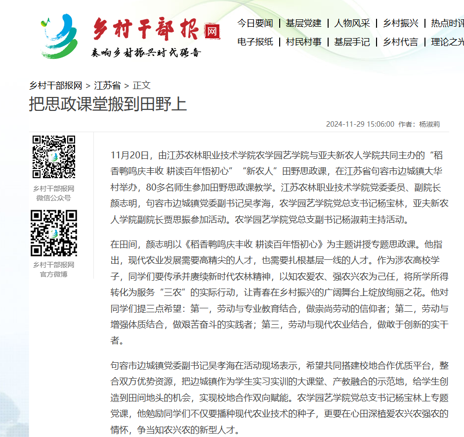 【江苏教育】【乡村干部报】等报道米兰官网“稻香鸭鸣庆丰收 耕读百年悟初心”“新农人”田野思政课活动。