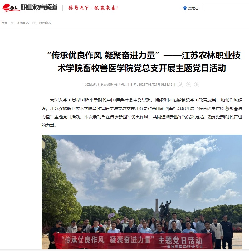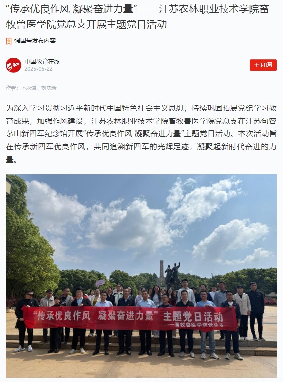 近日,米兰官网畜牧兽医学院党总支在江苏句容茅山新四军纪念馆开展“传承优良作风 凝聚奋进力量”主题党日活动,得到学习强国强国号、中国教育在线的关注和报道。