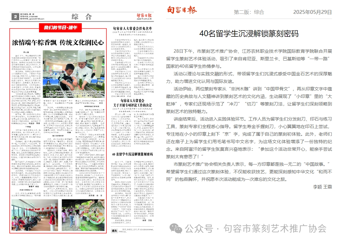 近日,米兰官网联合句容市篆刻艺术推广协会开展的“金石传古今 篆刻中国印”篆刻艺术国际推广活动受到江苏省内多家主流媒体的关注和报道。新华日报·交汇点、今日镇江、句容日报等媒体纷纷聚焦此次活动,展现了米兰官网在促进中外文化交流、助力留学生深度体验中国文化方面的积极成果。